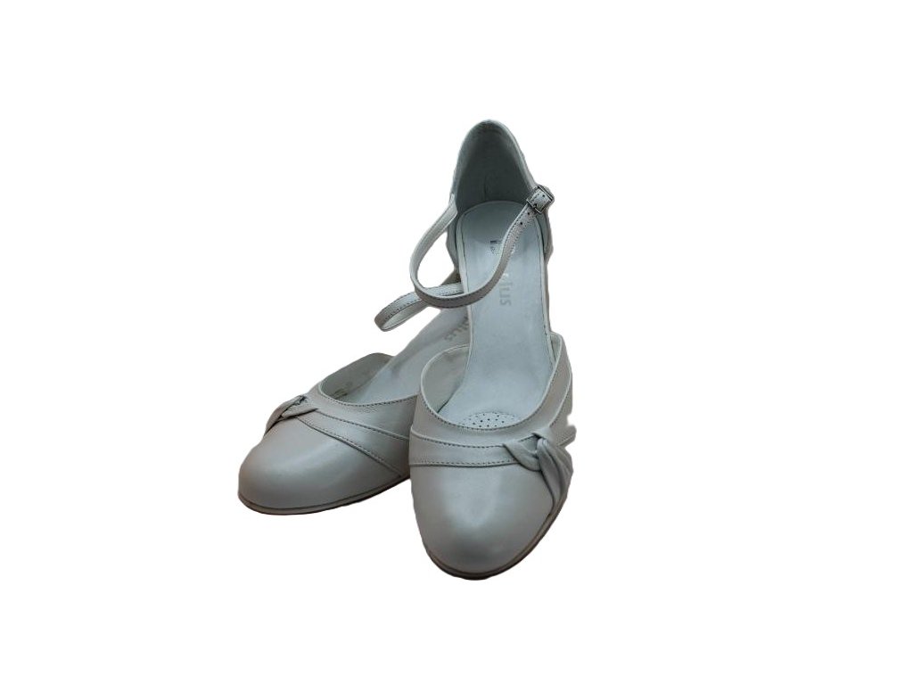 Celokožená bílá lodička na pohodlném širším podpatku. Lodička má zapínání na pásek kolem kotníku, délka pásku je 20 cm. Podpatek 6 cm.