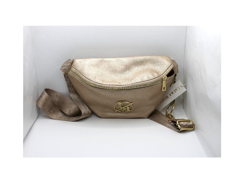 Zlatá dámská ledvinka ze syntetické kůže na zip. Může se dát přes rameno i kolem pasu s ozdobnými kruhy.