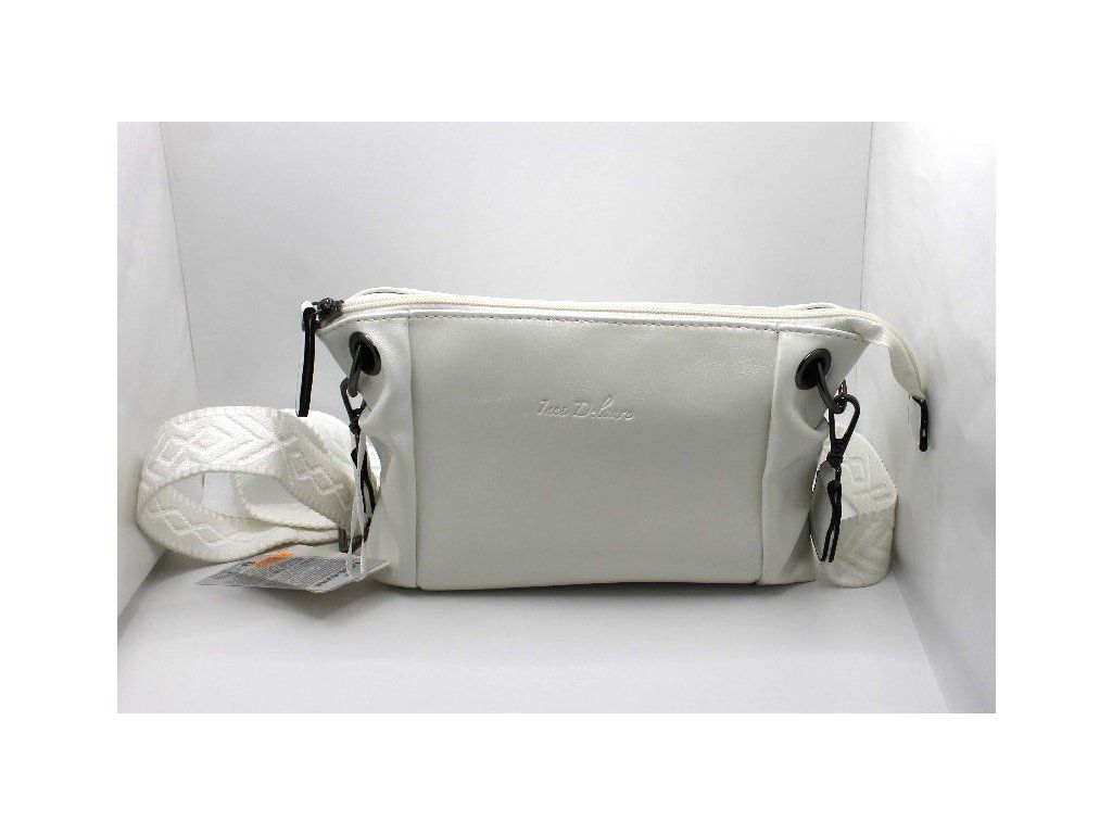 Bílá kabelka ze syntetické kůže. Šířka 27cm, výška 17cm. Na zip, vnitřní kapsa není na zip. Dlouhý řemen s ozdobnými kruhy.